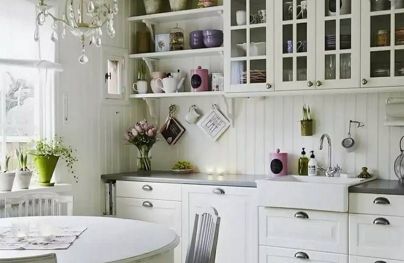 Сервиз, чайники, вазы — всё должно быть выдержано в едином стиле. Выбирать лучше простую посуду — она придаст элегантности интерьеру. Баночки со специями на полках не только удобно использовать. Они могут стать отличным дополнением декора. Оригинально смотрятся декоративные блюда на стене.