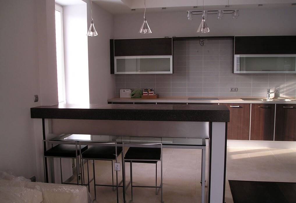 в виде барной стойки, совмещенной с рабочей поверхностью.