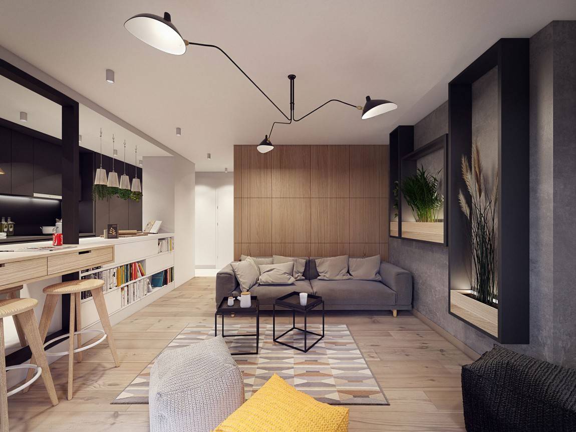 Создание в квартире студии нескольких световых зон – это не только эффектный внешний вид, но и элемент удобства. Подумайте: яркие светильники с регуляторами длины позволят разглядеть мелкие детали на рабочем столе, приглушенный свет над обеденным столиком создаст романтическую атмосферу, оригинальный торшер станет незаменимым во время вечернего чтения.