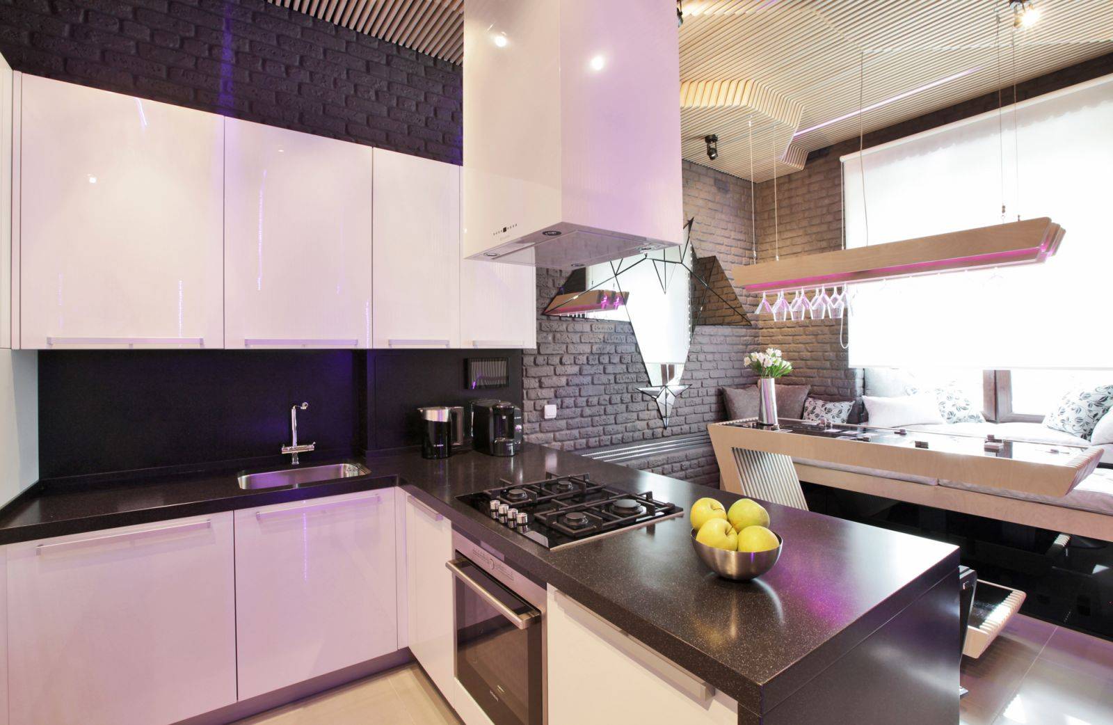 Разделителем между зонами может стать подиум, барная стойка, небольшие ступеньки. Для верха идеальным решением станут натяжные или навесные потолки, разноуровневые подсветки.