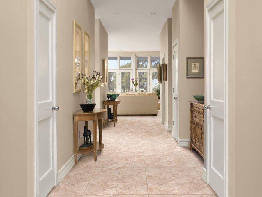 Потолочное покрытие допустимо сделать белым. Отличным вариантом могут стать и молочные, светло-бежевые оттенки. Напольное покрытие не следует делать чересчур темным, потому что на нем будут сильно выделяться любые загрязнения. Светлые варианты будут смотреться в интерьере коридора более выгодно.