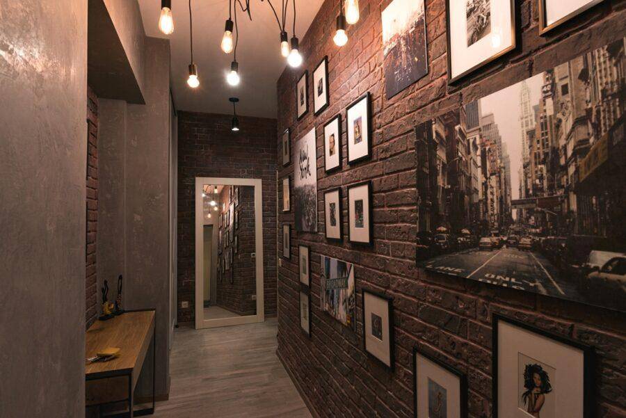 Дизайн узкой прихожей декорированной кирпичными вставки