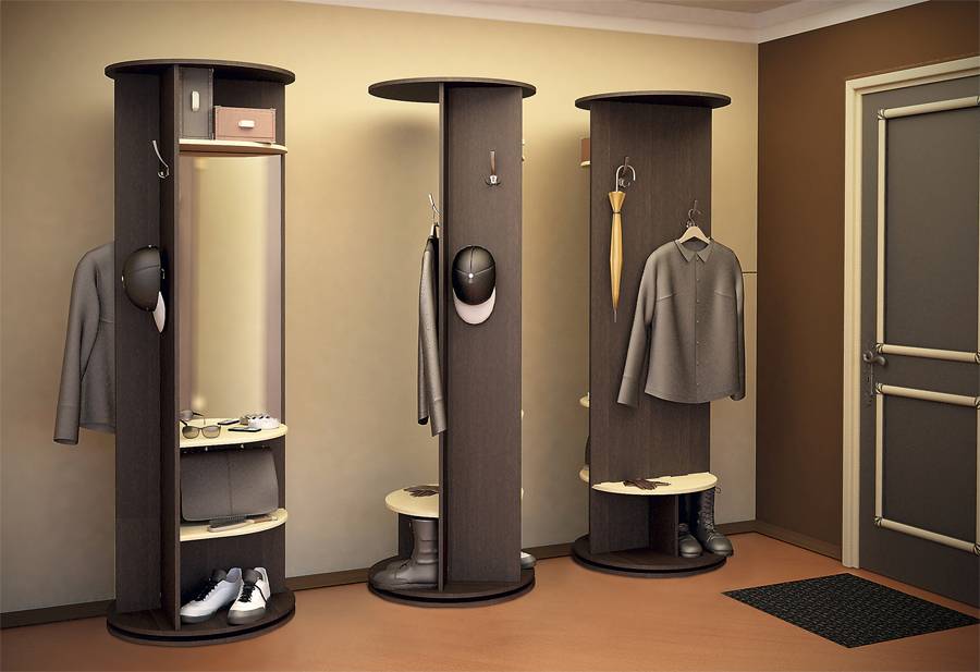 Прихожая на поворотном механизме появилась сравнительно недавно, но уже успела найти своих поклонников. По сути, это вешалка для одежды с зеркалом и тумбой. Главное ее отличие от классической напольной прихожей — это механизм, позволяющий поворачивать конструкцию вокруг своей оси, что дает возможность использовать обе стороны с пользой.