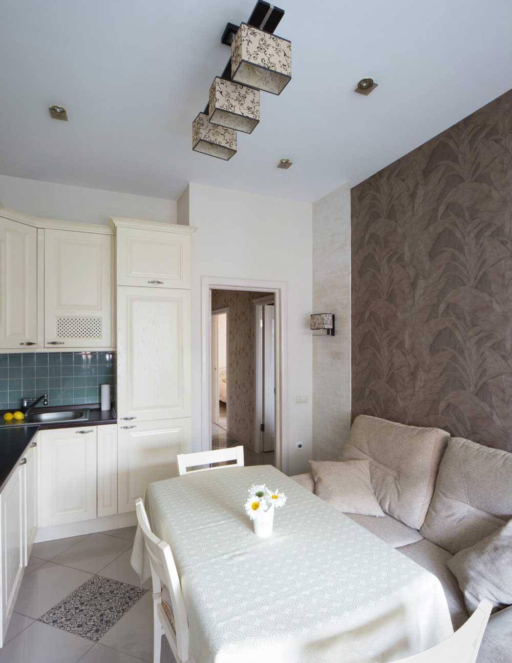 Даже небольшое пространство нуждается в организации качественного, как естественного, так и искусственного освещения. Оптимальным вариантом является установка точечных светильников. В малогабаритном помещении над обеденной группой будет уместна подвесная люстра с простым плафоном. Центральную часть комнаты можно оборудовать потолочным светильником, имеющим гладкую поверхность.
