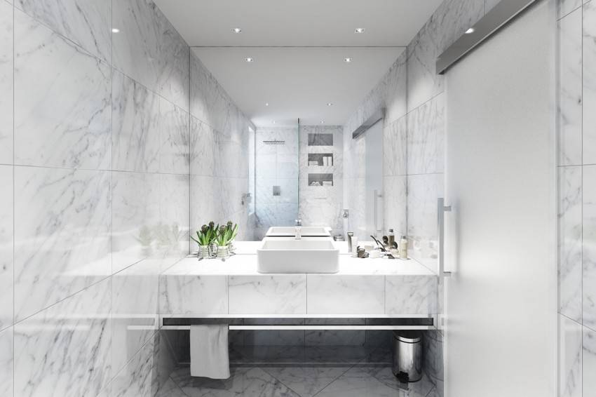 Так, важно равномерно подсветить пространство на разных уровнях, оформить стены и полы в светлых тонах с контрастными узорами и аксессуарами. Поможет увеличить объем и мелкая плитка, широкие зеркальные поверхности и потолок, покрытый глянцем.