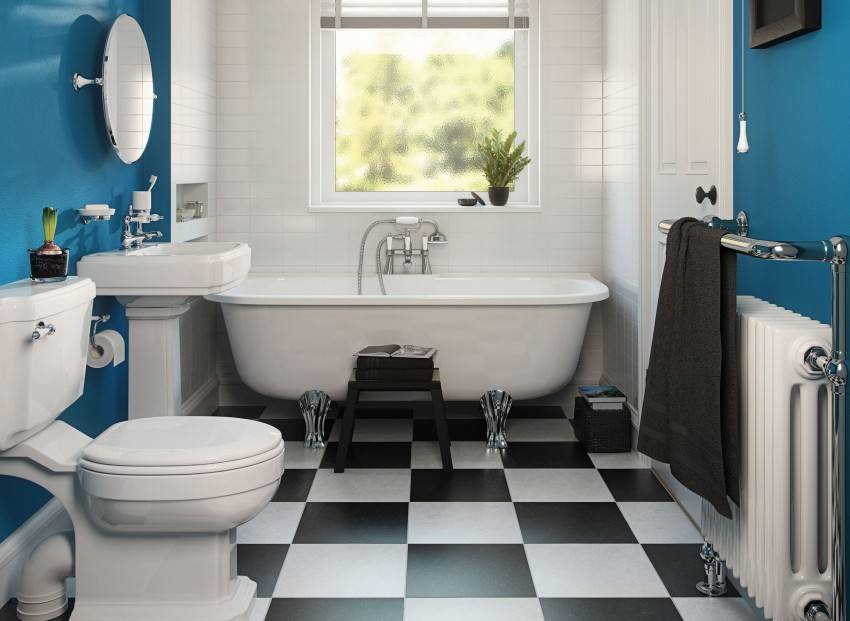 В базовый набор составляющих интерьера входят: ванна, унитаз, раковина, зеркало, стиральная машина, полки, полотенцесушитель, зеркало. Расположение зависит от типа планировки и подвода коммуникаций. Ванну можно установить напротив либо справа от входной двери. Мойка располагается рядом с ней, над раковиной вешают зеркало с полками либо без них.
