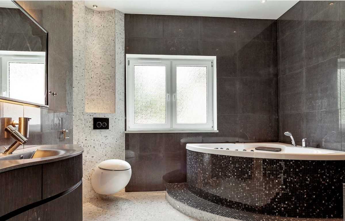 Сочетание материалов приветствуется в просторной ванной комнате с некоторыми оригинальными моделями керамической настенной и напольной плитки. И если вид позволяет вам, вы можете организовать его таким образом, чтобы вы могли наслаждаться прекрасным видом из собственной ванны. Ванна отлично смотрится рядом с большим окном. Независимо от выбранных оттенков, большая ванная комната — это то, что радует любого, кто ищет минуты отдыха.