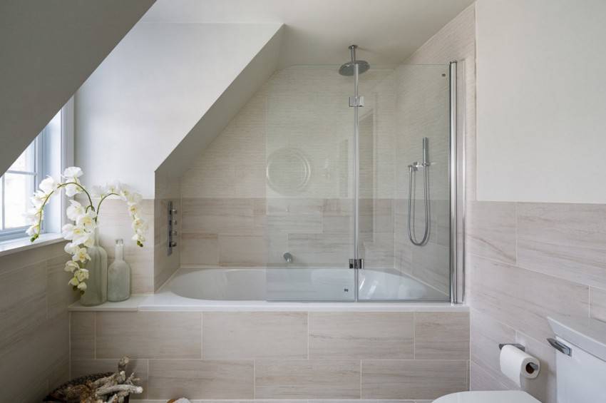 Проект ванной на мансарде. Использование разной фактуры для отделки пола, стен и потолка. Рациональное размещение мебели, использование ниши и задействование угла под душевую кабину.
