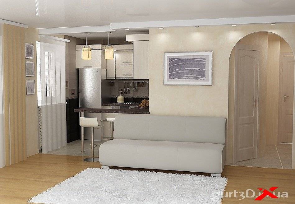 - совмещение зала с кухней позволяет выделить отдельную зону для приготовления пищи, столовой и отдыха, не обремененные лишними стенами. Разграничить описанные зоны можно при помощи отделки стены, пола и потолка, посредством сооружения передвижных этажерок, а также при помощи легких занавесей из ниток и так далее;
