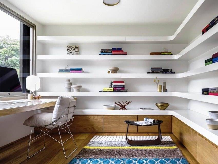Светлый интерьер кабинета выглядит всегда спокойным и уютным