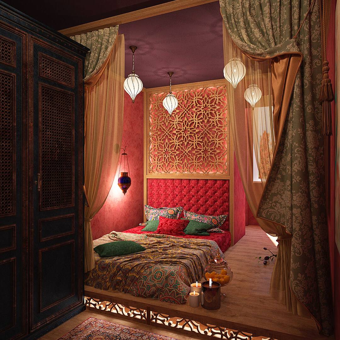 Для дизайна в восточном стиле характерны натуральные материалы для отделки и мебели, много текстиля, многослойность в оформлении окон, ниши для аксессуаров. В оформлении преобладают насыщенные тона, но их подбирают так, чтобы они хорошо сочетались между собой. Дизайн спальни 15 кв. м получается чувственным и магнетическим.