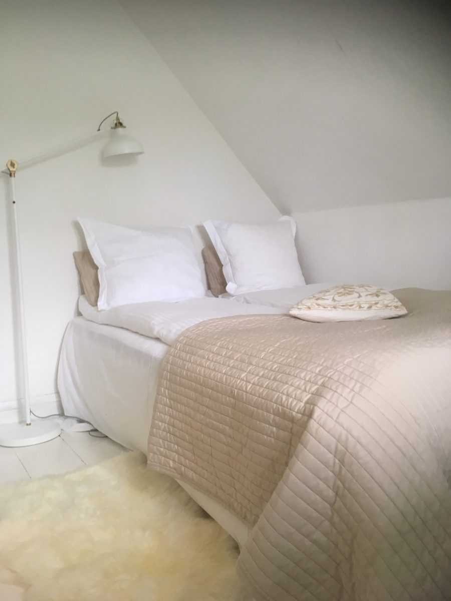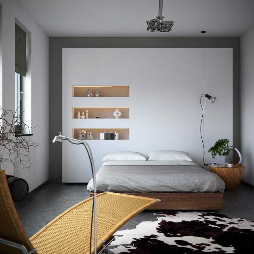 Недостаток квадратов в спальне компенсируют хорошим освещением и светлой отделкой. Огромные окна не драпируют или используют жалюзи в тон стен. Снежную стерильность дизайна подчеркивают темные полы и мебель, серый текстиль. В изголовье кровати часто монтируют полку с живыми растениями и семейными фотографиями. На потолке – светильник простой формы.