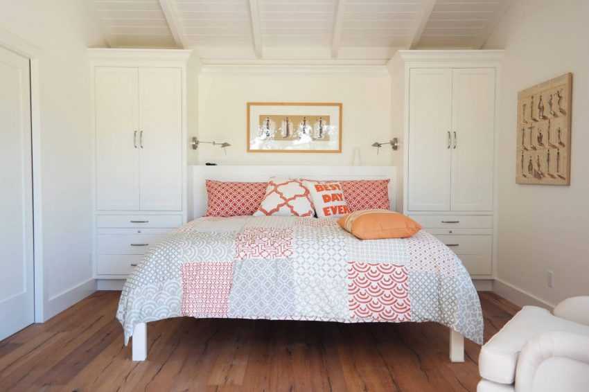 - Во-вторых, возле кровати можно поставить прикроватные тумбочки, а по обе стороны от входа – шкафы.