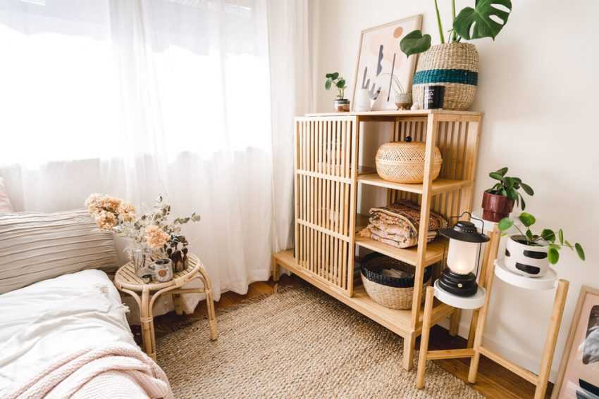 Чтобы максимально разгрузить пространство, рекомендуется обратить внимание на многофункциональные предметы, например, кровать с выдвижными ящиками или открытые пеналы вместо тумб