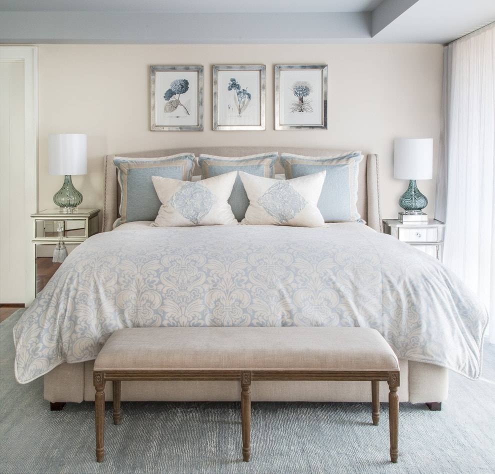 Если позволяет место, у изножья кровати можно разместить небольшую банкетку или тумбу, на которые будет удобно складывать покрывала и декоративные подушки.