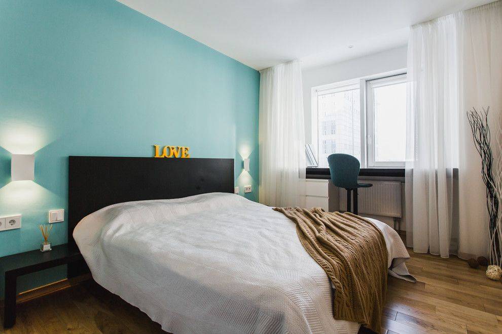 Синие оттенки считаются самыми подходящими для спальных комнат. Яркие и насыщенные тона не лучшим образом подходят для спален, нужно выбирать мягкие и спокойные оттенки. Как известно, синий цвет – успокаивает, в такой спальне вы почувствуете себя расслабленными, будете быстрей и проще засыпать.