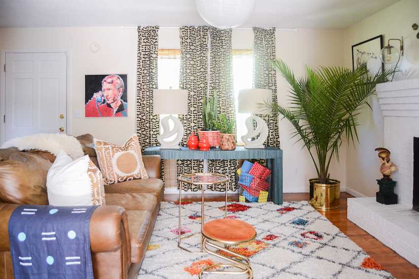 С одной стороны дивана поставьте журнальный столик, продумайте свет: бра или торшер. С другой – разместите компактную тумбочку. Такая компоновка мебели в ретро стиле будет выглядеть уместно в прямоугольной комнате с одним окном, противоположным входу.