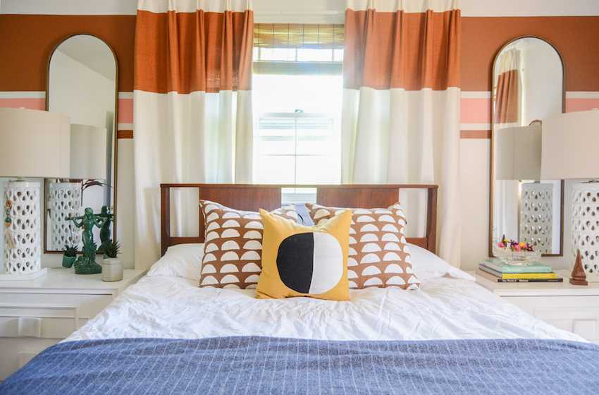 Интересным решением будет оформить спальню в африканском стиле. Песочные или оранжевые оттенки на стенах, вместе с бамбуковыми занавесками создадут иллюзию саваны. Подчеркнут направление детали. На полу будет отлично смотреться шкура животного, а на стену в изголовье кровати лучше наклеить фотообои из жизни тропиков.