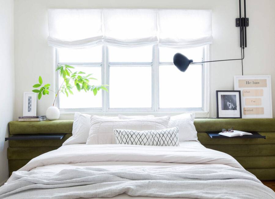 Лучше всего в современную спальню подойдут самые простые и практичные римские шторы либо любые другие роллеты. Они крепятся на весь оконный проем или непосредственно на створку, так что не загромождают пространство и не собирают пыль. Если любишь спать в полной темноте, без раздумий выбирай подкладку блэкаут.