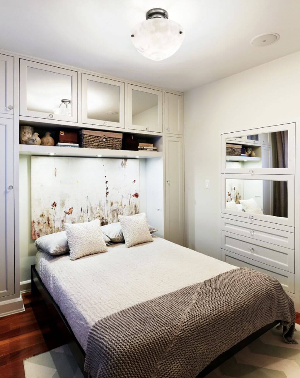 В маленькой спальне также важно обратить внимание на то, чтобы эффективно использовать углы – зачастую это функциональное пространство в интерьере оставляют незадействованным, однако правильное использование углов может существенно помочь вам сэкономить место в вашей комнате. Часто в углах отлично размещаются шкафы – кроме того, для экономии места они могут быть максимально высокими