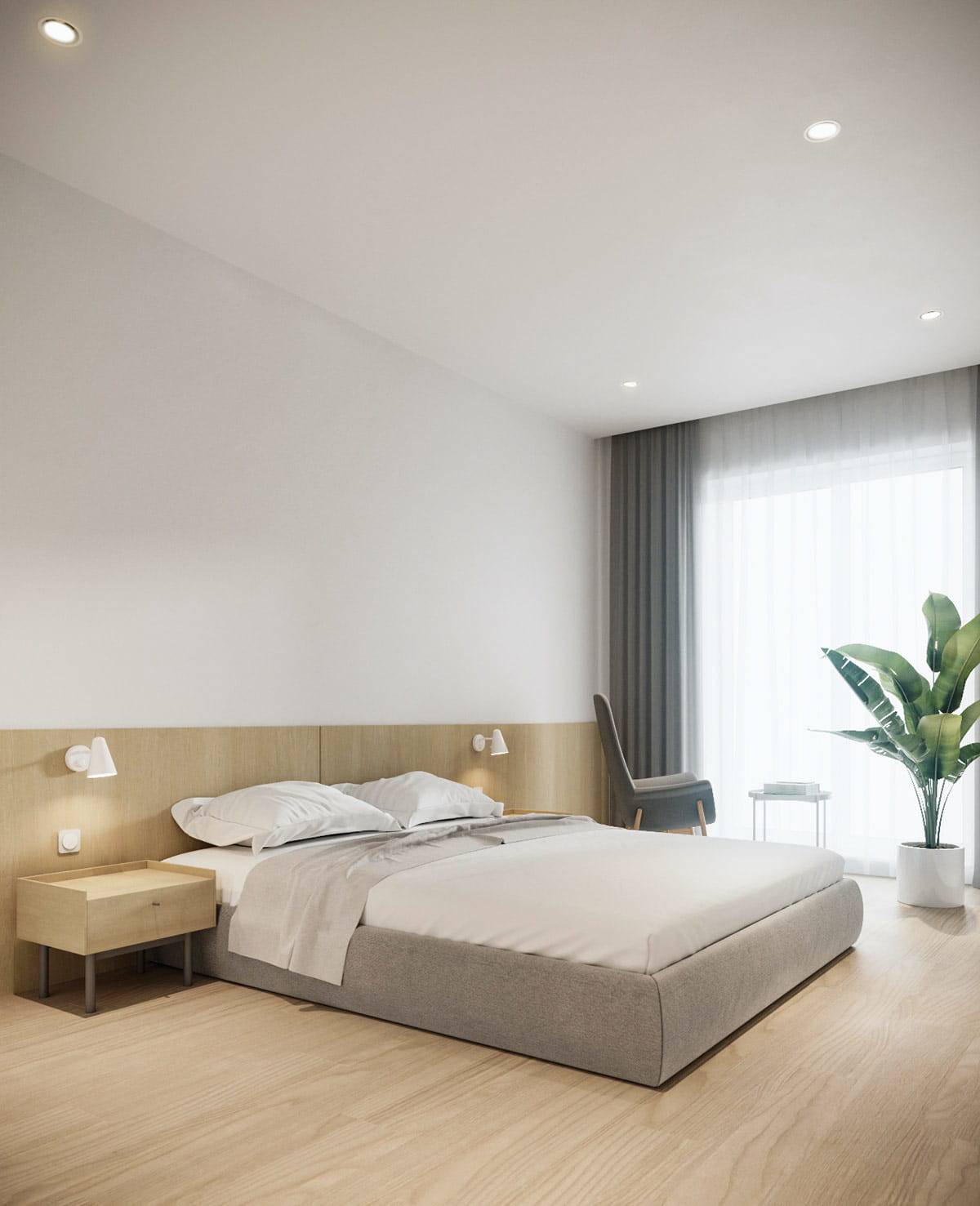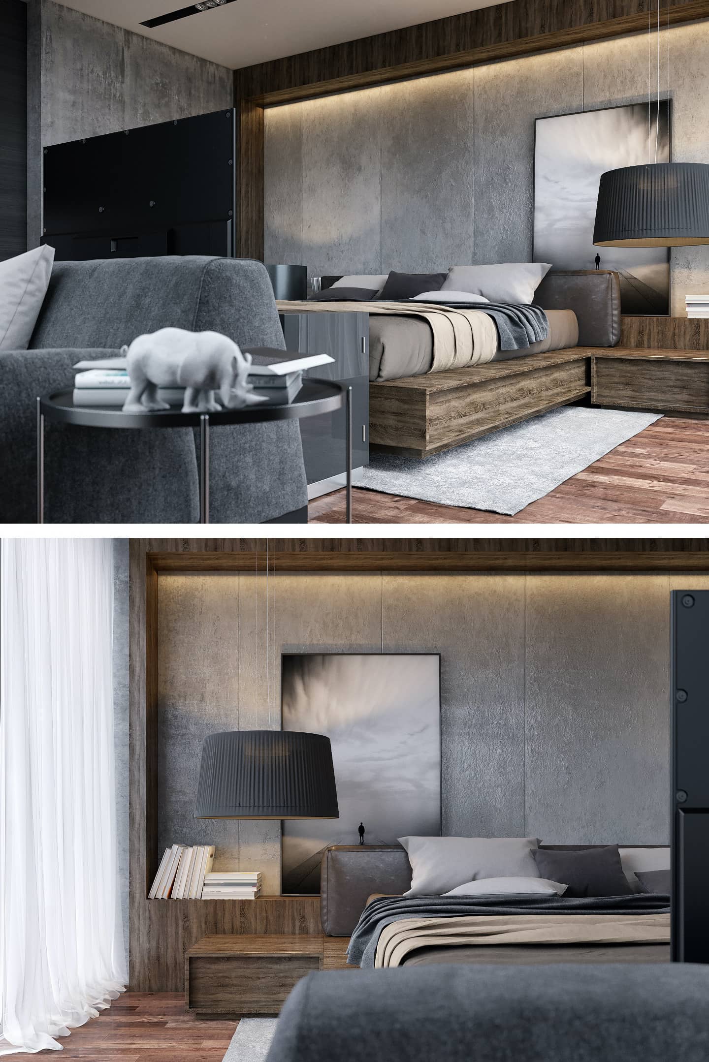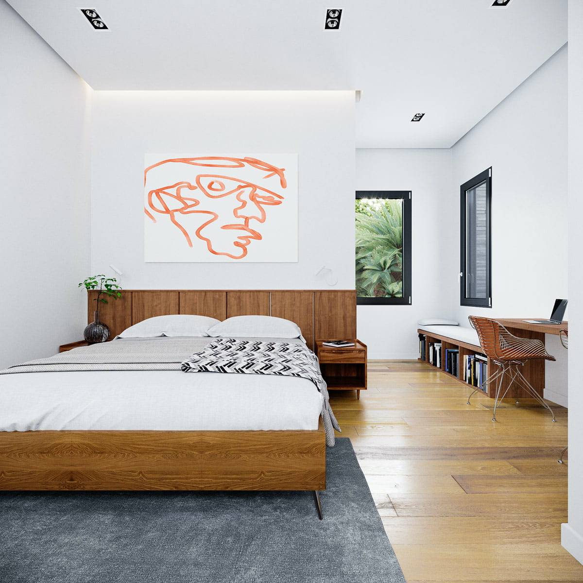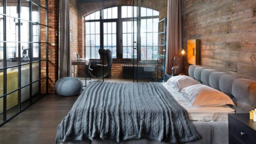 Стена за изголовьем часто делается акцентной – оставь кирпичную кладку, бетон или обшей ее деревянными панелями. Фотообои в современных интерьерах не слишком распространены. Если хочешь цветовой акцент – возьми темно-коричневую или темно-серую краску.