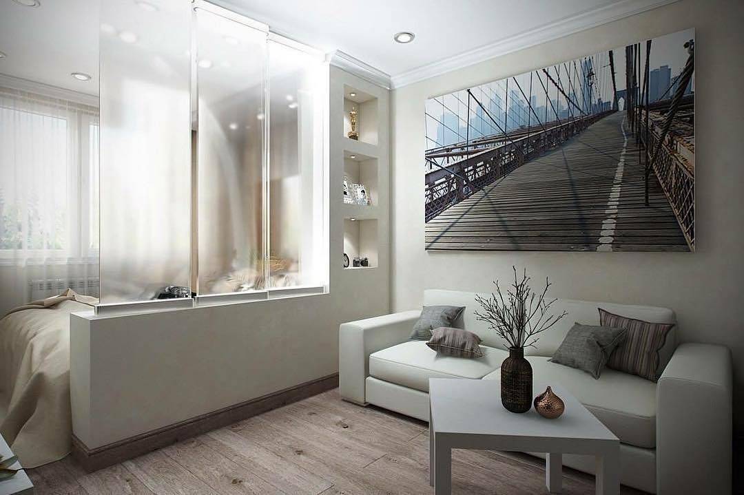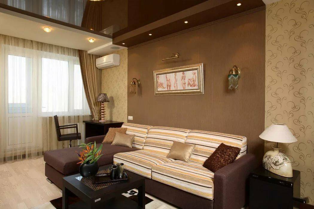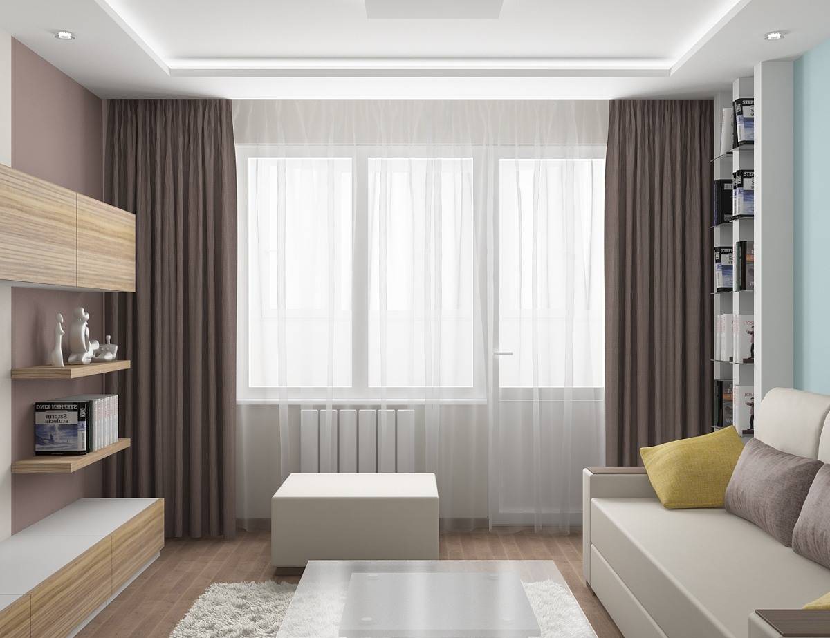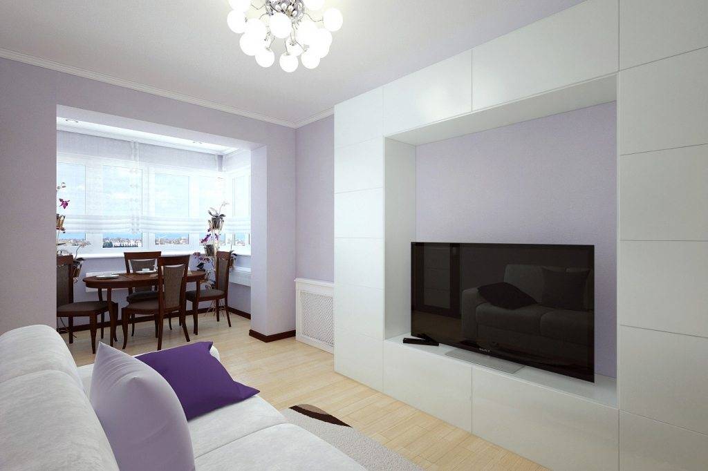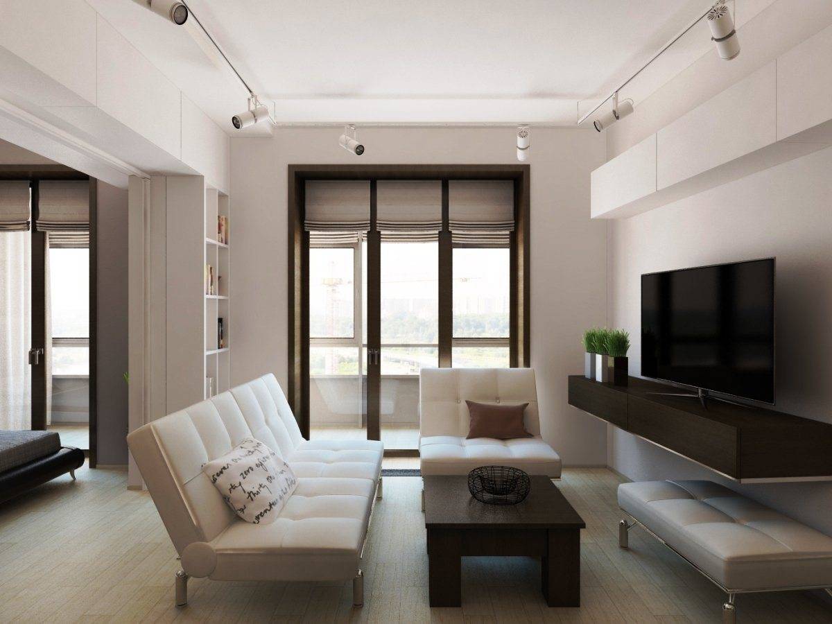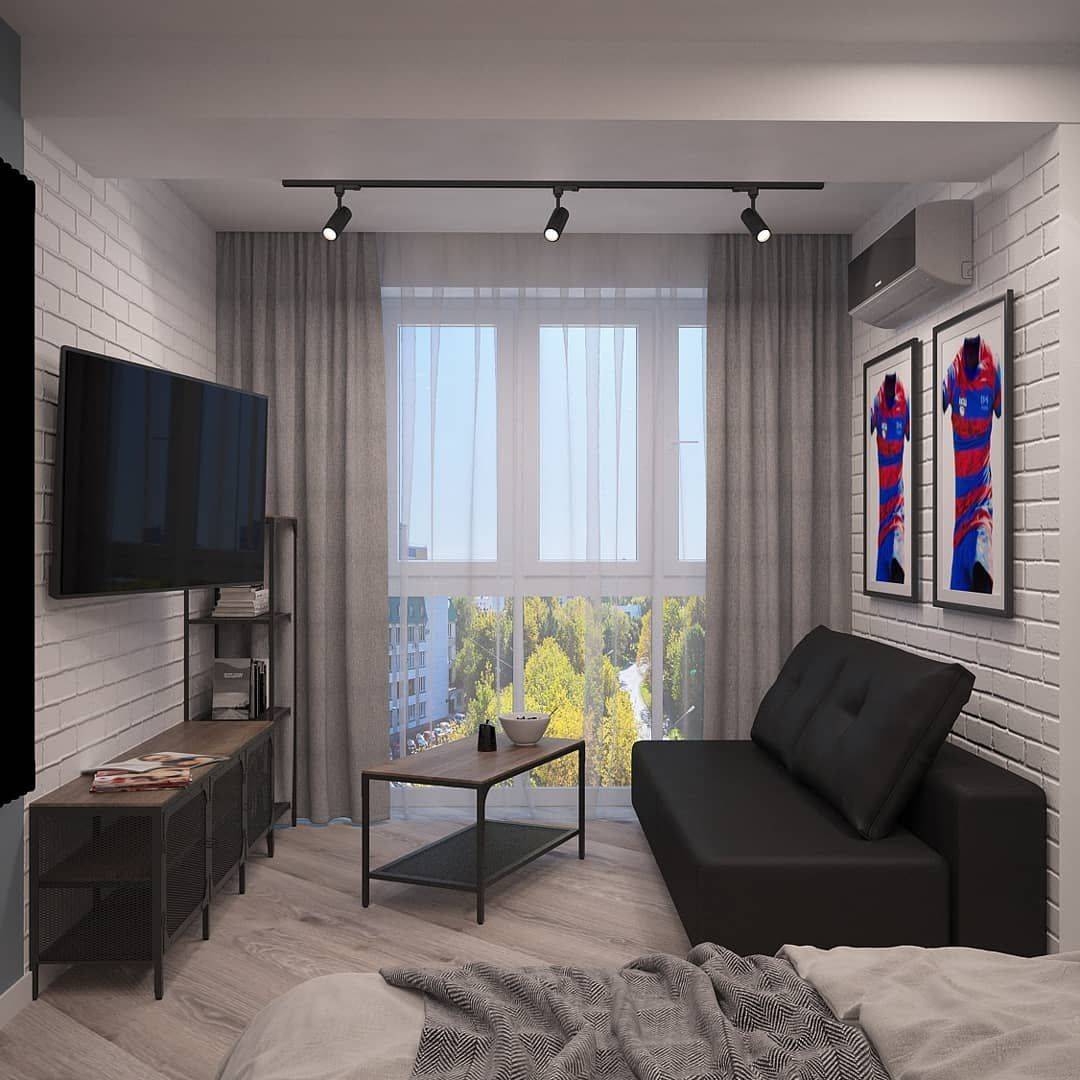 Те же самые рекомендации относятся и к однокомнатной квартире, если жилая комната выполняет функции спальни, как на фото дизайна просторной комнаты с присоединяемым балконом.