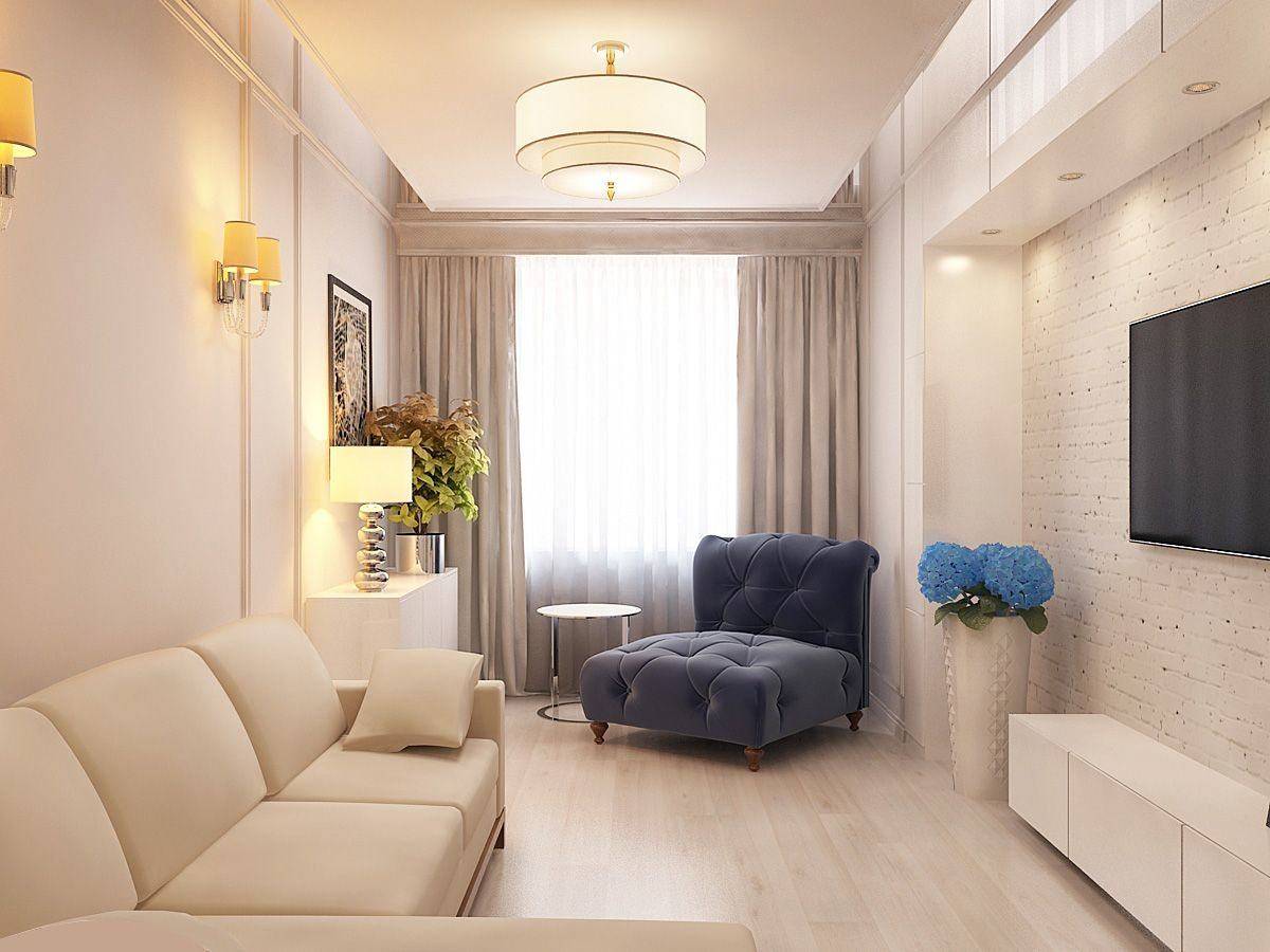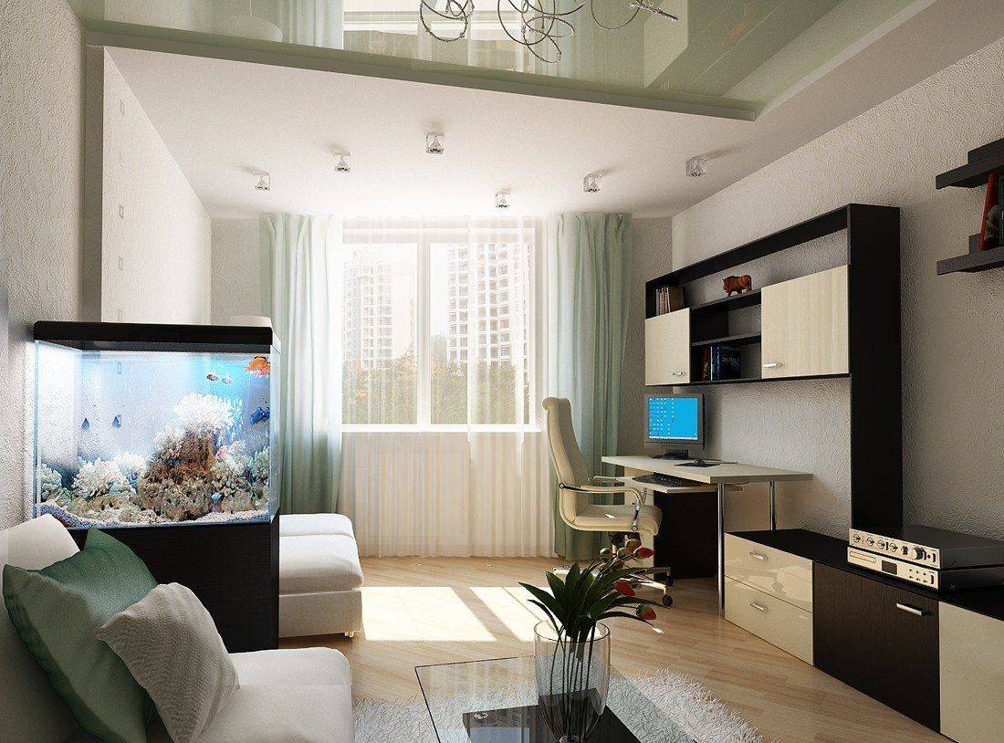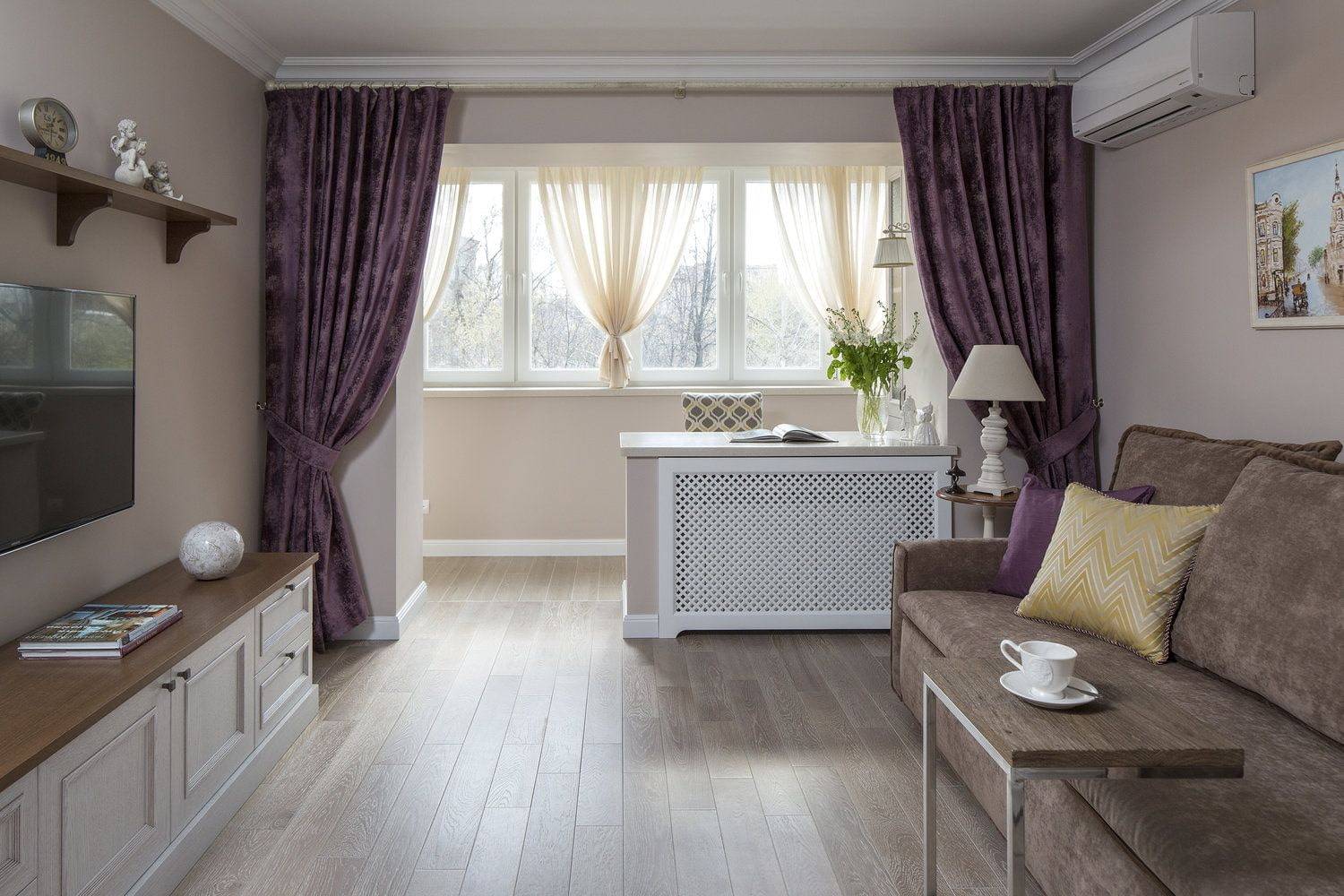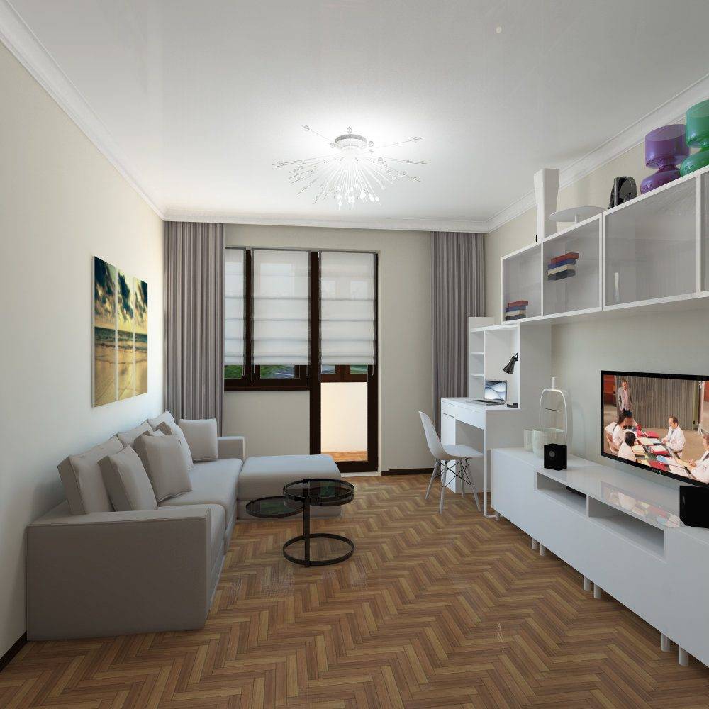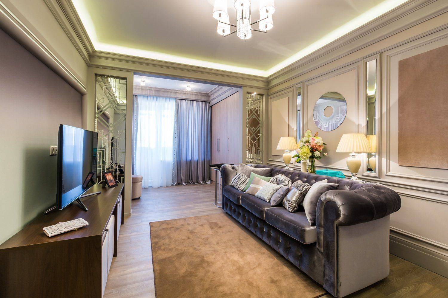 Те же самые рекомендации относятся и к однокомнатной квартире, если жилая комната выполняет функции спальни, как на фото дизайна просторной комнаты с присоединяемым балконом.