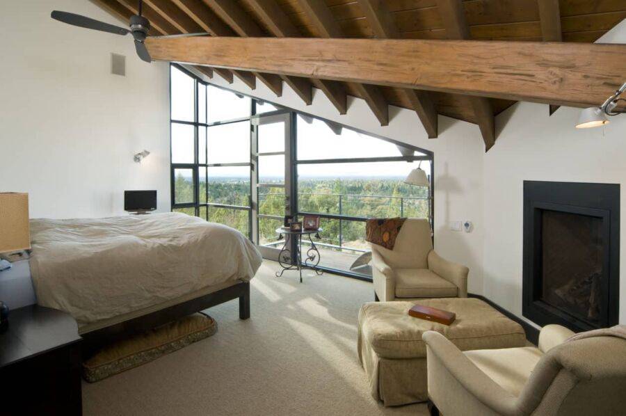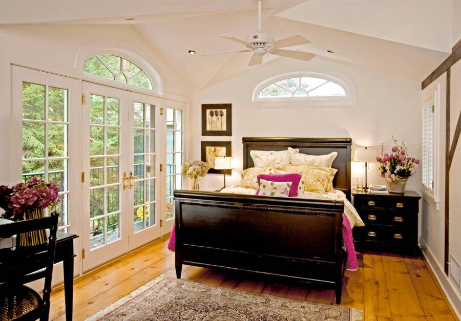 - Необычный дизайн. Полученное от объединения пространство можно интересно декорировать: идеи в интерьере спальни с балконом — панорамные окна, вместо квадратного проема арка, подиум и так далее.
