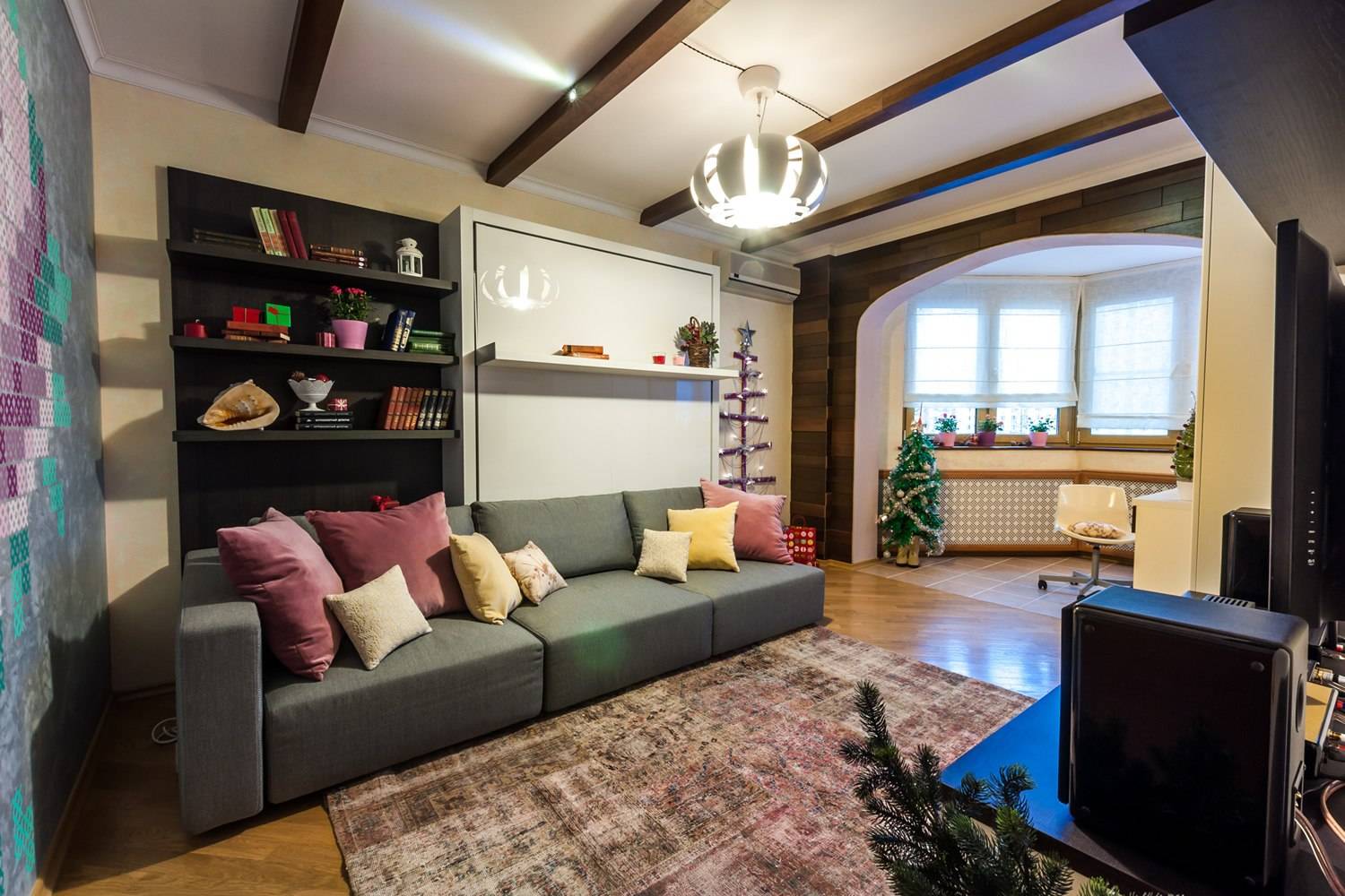 Если вы решили соединить лоджию и комнату ради увеличения пространства, то отличным решением будет использование раскладной кровати или дивана и высоких шкафов в потолок.
