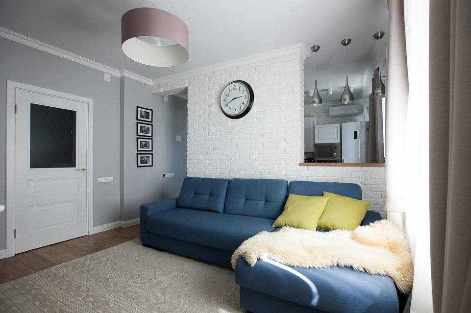 Еще один оригинальный метод совмещения двух функциональных зон в одну – это установка перегородок. Данный метод позволит существенно сэкономить пространство и разнообразить интерьер комнаты не более 17 кв. м. Перегородка может быть: стеклянной, деревянной, тканевой. Также зонирование может осуществляться с помощью гипсокартонной перегородки, форму и размер такого рода постройки можно выбрать самостоятельно.