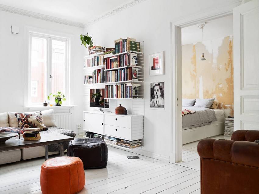 В качестве системы хранения в таких квартирах очень часто используются абсолютно все стены. Верхние шкафы кухонного гарнитура доходят до потолка или же могут располагаться в два уровня. Раскладывающийся диван и телевизор обрамляются полками. А вдоль стены коридора размещается компактная гардеробная.