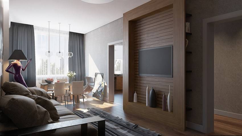 При прямоугольной форме помещения, важно грамотно организовывать зонирование для разделения жилой площади на две части, чтобы придать ей более пропорциональный вид