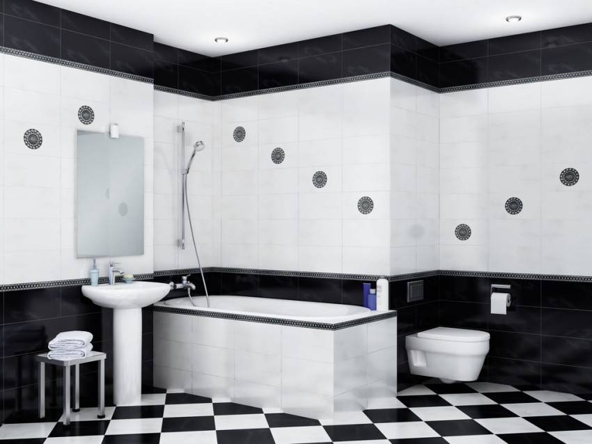 Классическим вариантом раскладки плитки в ванной комнате считается светлый верх и тёмный низ, разделяемые бордюрной чертой посередине. Но не обязательно строго следовать порядком поднадоевшей схеме. Тем более, что большинство дизайнеров просто-напросто не рекомендуют обустройство маленьких ванн в таком стиле, ведь таким образом визуально уменьшается и без того не большое пространство, даже если кафель расположить горизонтально. Вообще, маленький санузел лучше не перенасыщать декоративными элементами, особенно если учесть что там и так слишком много различных предметов: полочек, специальной мебели, сантехники, бытовых устройств и так далее.