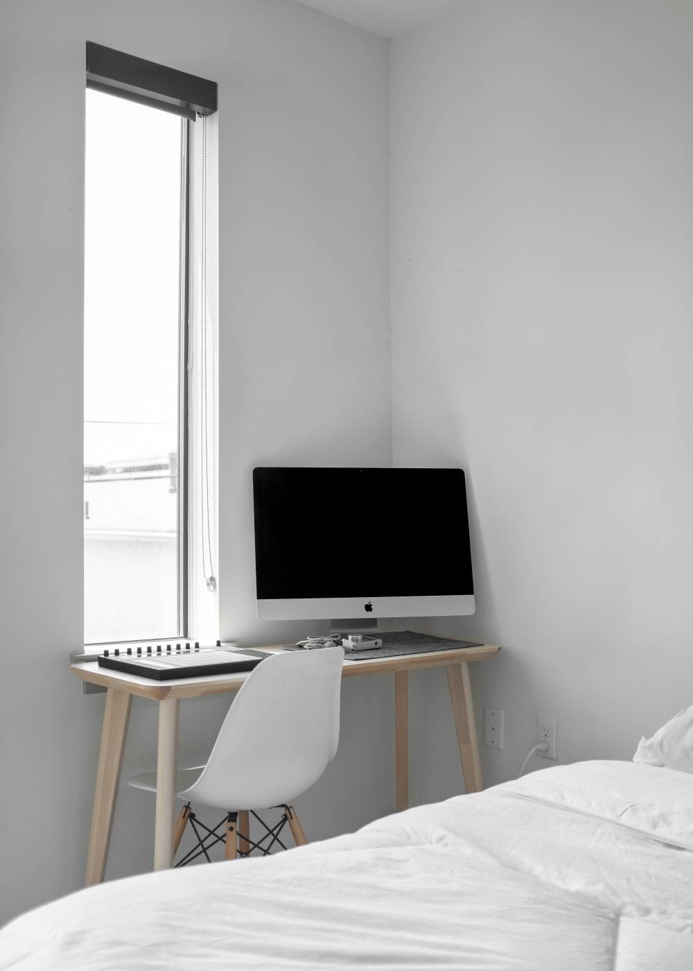 Если у вас длинная узкая спальня в квартире, также должна служить рабочим местом, вам нужно будет найти место для письменного стола и кресла. Также нужно помнить о месте для хранения документов — достаточно небольшого шкафа с выдвижными ящиками. Благодаря им вам будет легче сортировать рабочие тетради или документы.
