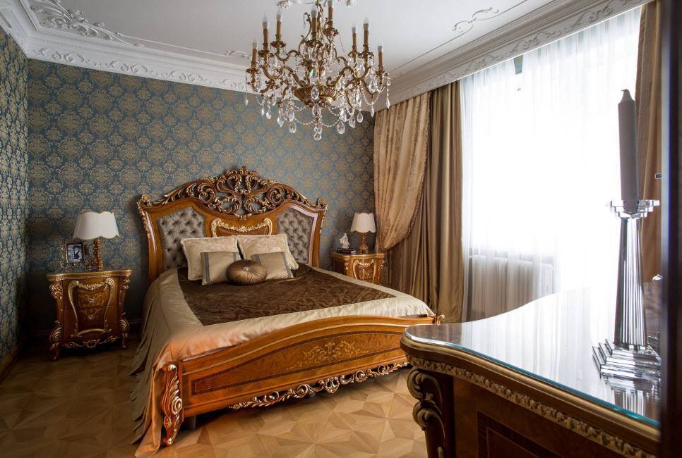 Классическое оформление интерьера предполагает строгую симметричность линий, сдержанную красоту мебельной обстановки в целом. Отличительные признаки этого дизайнерского направления – удобная эмалированная мебель с выгнутыми резными ножками, высокое изголовье кровати, изящная люстра.