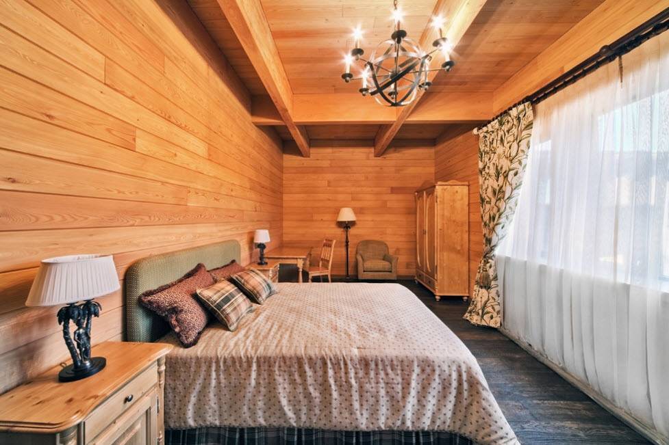 При оформлении прямоугольной опочивальни стоит учитывать недочеты этого помещения: длина в сочетании с небольшой шириной, высокие потолки.