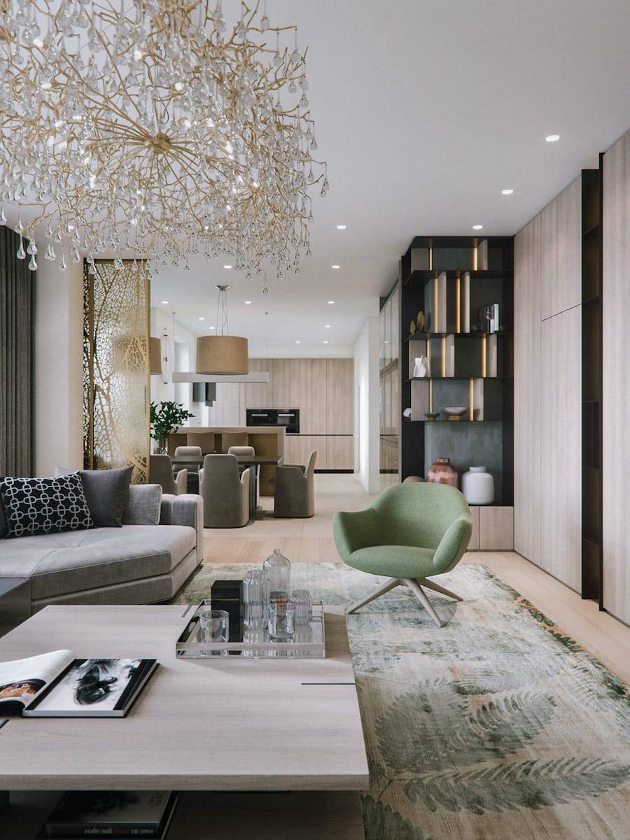 Стиль ар-деко набирает популярности в этом году и вытесняет другие недавно популярные тренды. Для него характерно использование крупных геометрических узоров на шторах, стенах, полу и других декоративных элементах. Различные причудливые формы встречаются при отделке люстр или светильников. Активно используются мотивы, которые позаимствовали с оформления известных во всем мире произведений архитектурного искусства. Все это сочетается с модными цветами в дизайне интерьера 2020. Наиболее распространенные из них – золотой, салатовый, бежевый.