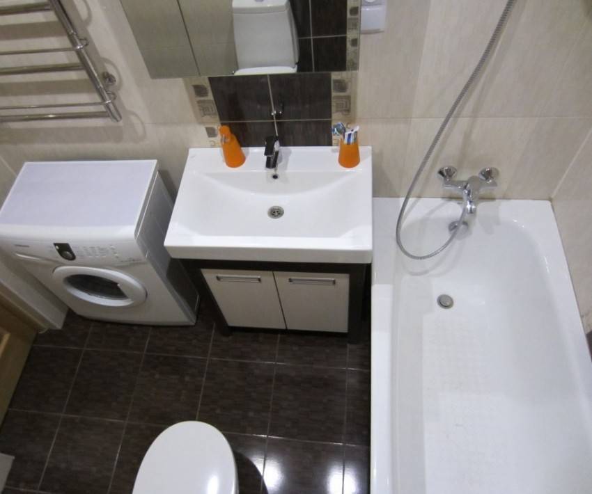Если наличие отдельной ванны является обязательным условием, в таком случае размещение стиральной машины и раковины желательно предусмотреть в другом месте.