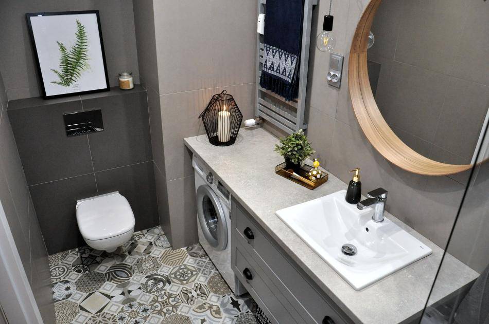 Малогабаритная современная модель стиральной машинки может занять свободную нишу под накладной раковиной; в шкафу над спрятанным сливным бачком; заполнить место, оставшееся между ванной / душевой кабинкой и стеной.