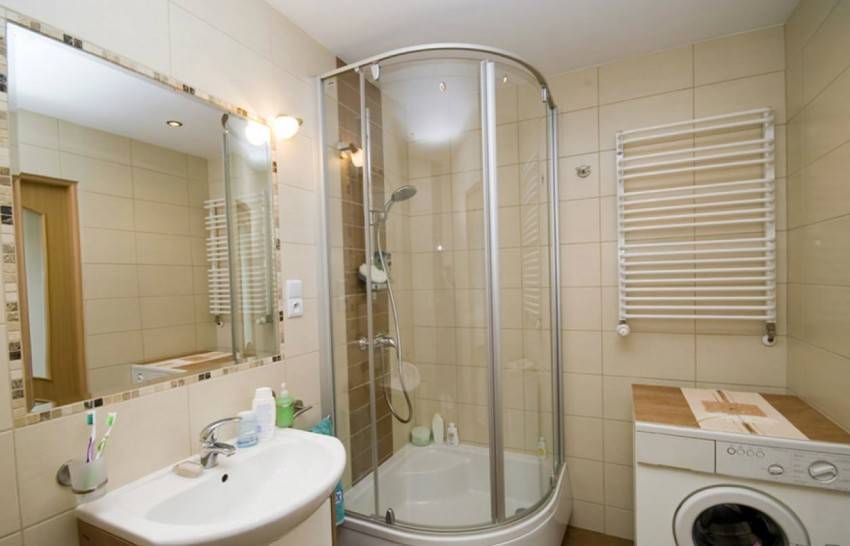 Минусы: не совсем комфортно будут открываться створки душевой кабины, ведь они блокированы. Задействована будет, скорее всего, средняя часть душевой.