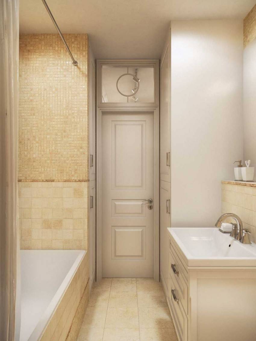 Ванна на фото ниже обладает размерами чуть более 3 кв. м, потому в ней удалось расположить ванну, раковину, стиральную машинку и вместительный шкаф-пенал.
