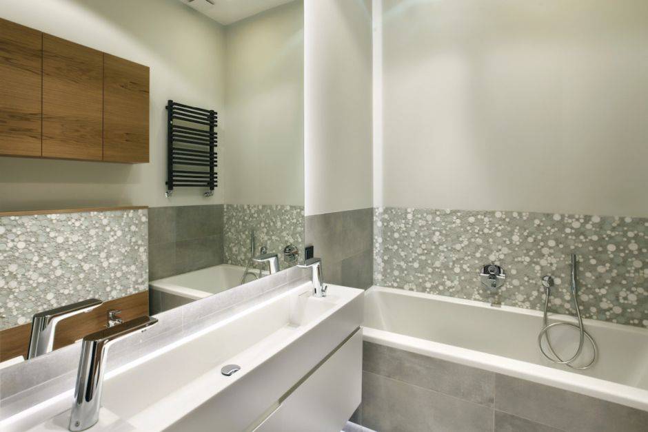 - все коммуникации и подводки зашиты в стены — ничего не напоминает о современных технологиях, кроме смесителей и мягкой подсветки;