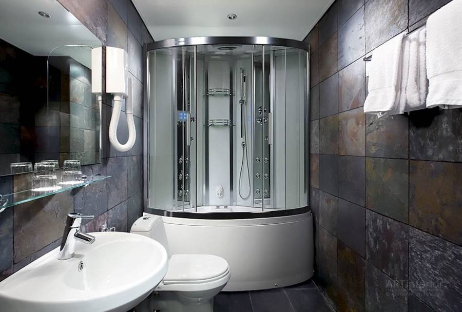 - Установка душевой кабины или ванны сидячего типа существенно экономит место, поэтому если в семье нет любителей полежать в ванне, рекомендуется остановиться на данном варианте.