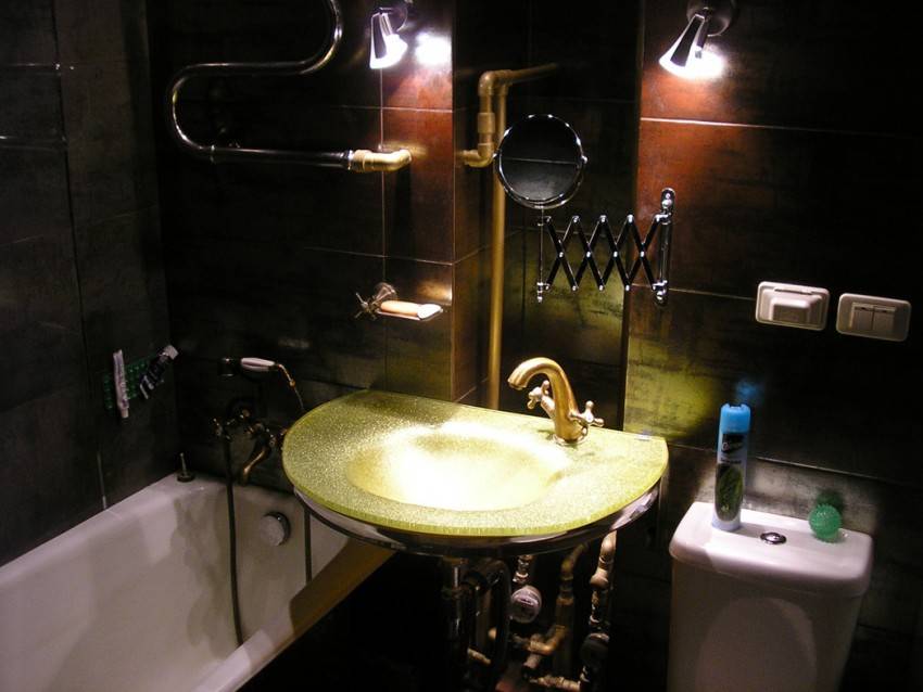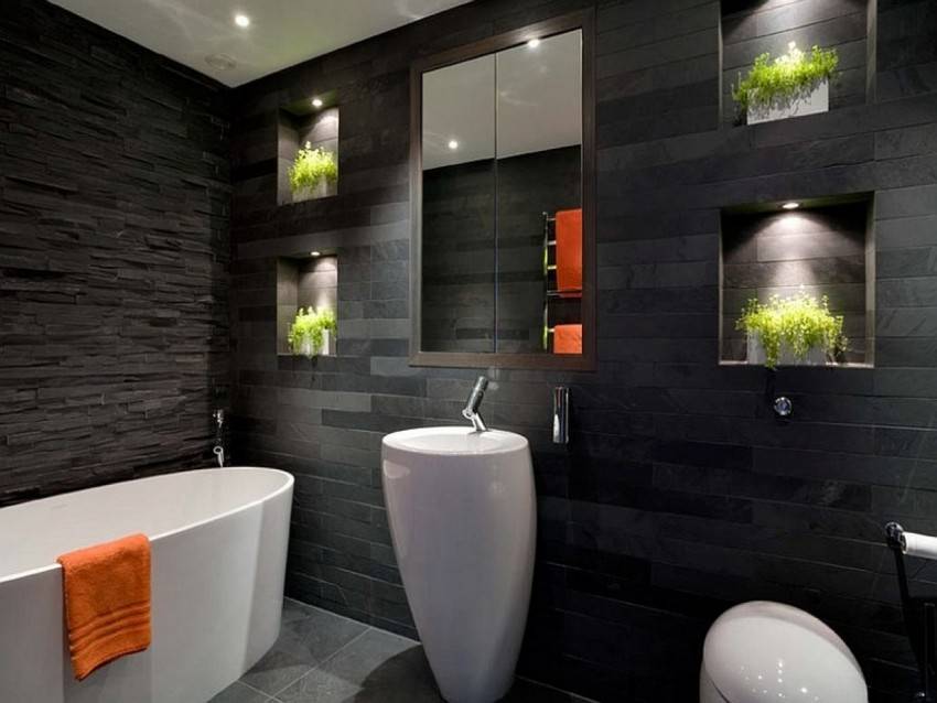 Сделать малогабаритную ванную в темном свете комфортной помогут акцентные стены. Например, черными можно сделать лишь пол и одну из стен, причем украсить последнюю оригинальным орнаментом или узором. Таким образом, вы избавитесь от мрачности и давления обстановки, а также создадите в помещении неповторимую атмосферу.
