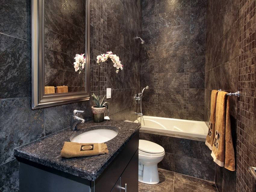 Небольшой площади ванная – это не повод отказываться от отделки ее в темных цветах. Просто тут нужно будет попотеть над реализацией мелочей, так как темная плитка уменьшит пространство. Вы сможете использовать в дизайне даже черный цвет, если добавите его дозировано, вперемешку с белым или другими сочетающимися оттенками. Черный может появиться в настенных узорах, потолочной росписи, акцентах, которым может стать ванная в темных тонах – как на фото.