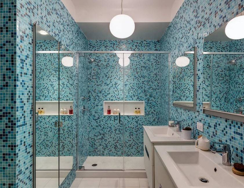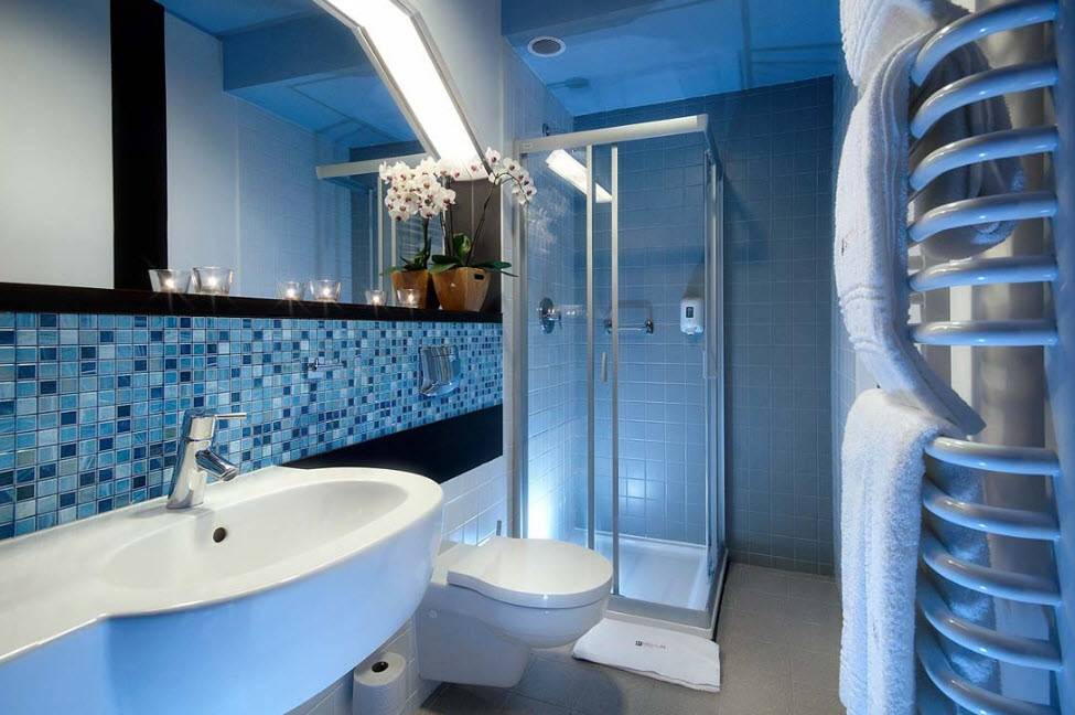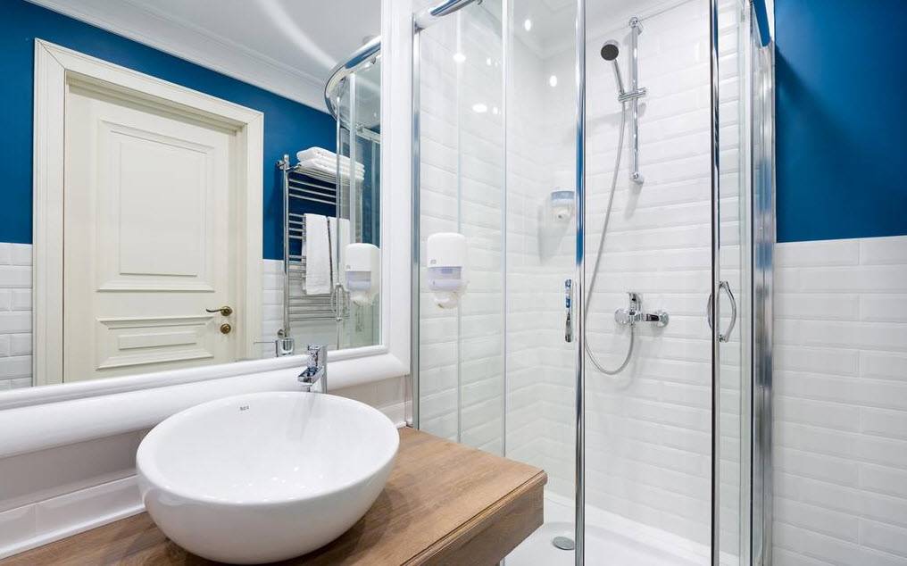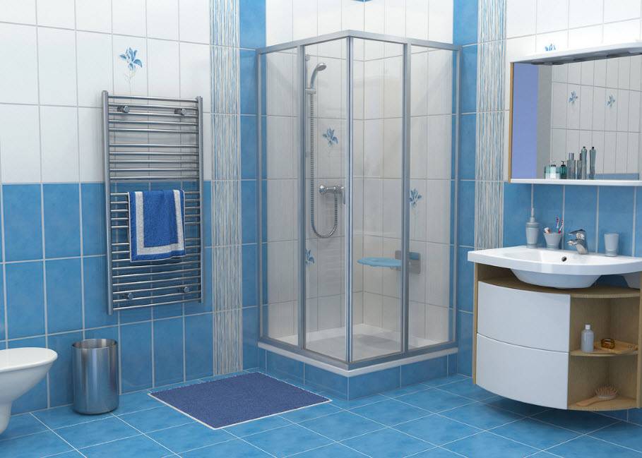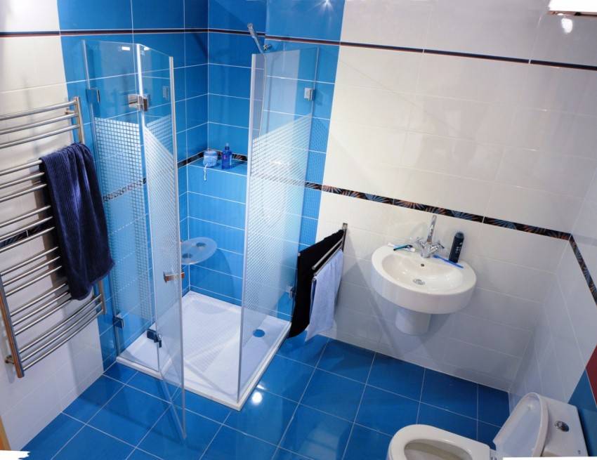 в сине-голубой гамме и миниатюрная душевая кабинка