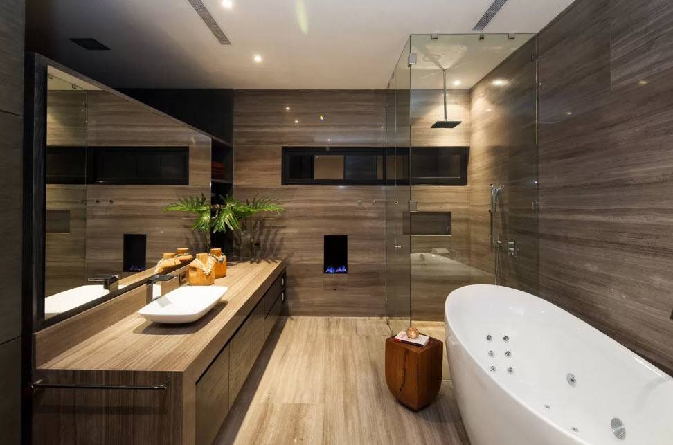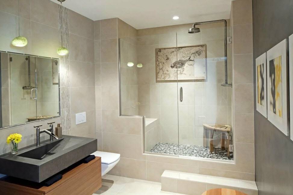Современный стиль. Данное решение подойдет для любителей хромированных и бетонных поверхностей, обилия стекла и светильников. Для оформления используется нейтральная цветовая гамма, яркими акцентами выступают элементы сантехники и текстиль. Основной акцент делается на эргономичность и наличие свободного пространства, декора здесь практически нет.