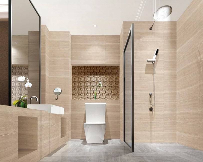 Фактура облицовки и ее размер могут быть разными. Как правило, в помещение с меньшей площадью берут однотонные отделочные материалы. Отделка просторных помещений может быть контрастной и узорчатой. Что касается плитки, то она актуальна для оформления стеновых перекрытий сборных кабин.