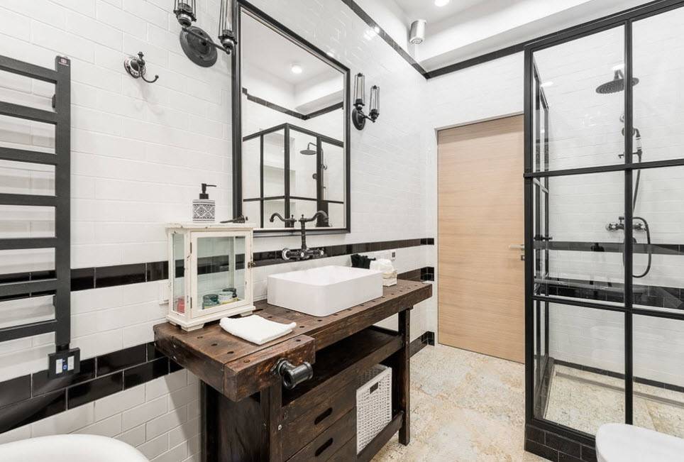 Лофт – промышленный стиль, который лучше реализовать в просторном помещении, где ключевым элементом интерьера служит кирпичная стена (естественного оттенка или окрашенная в белый цвет). Душевая кабинка – прозрачная, окруженная стенами с грубой отделкой и открытыми коммуникационными системами.