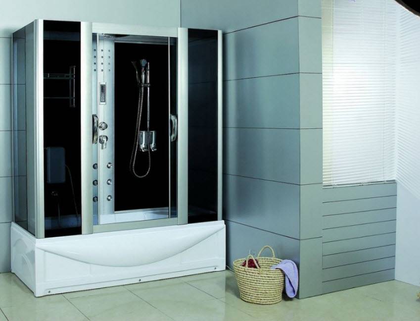 Еще одна существующая разновидность гидрокомплекса – ванна с душевой кабиной. Это что-то среднее между обычной ванной для лежания и стоячим душем. Поддон в таких моделях более комфортабельный – его размеры (от 80х150 см и высотой от 35 см) позволят принять ванну, выкупать ребенка или домашнее животное, организовать ручную стирку, пересаживание комнатных цветов и пр.